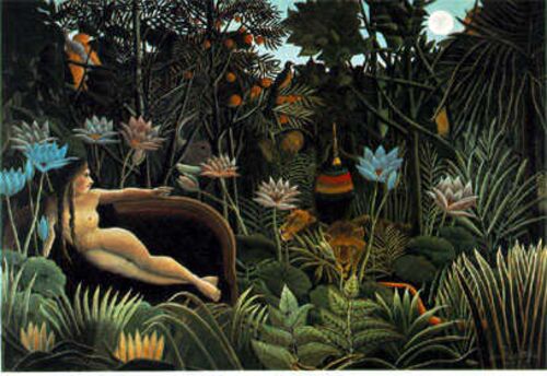 「甘美な夢の中のヤドヴィガ、いとも安らかに眠りへと誘われ、蛇使いの吹く笛の音を聴き、その瞑想を深く胸に吸い込む。そして緑燃える木々の波の上では、月影がきらめき、野生の蛇たちは、曲の陽気な調べに耳傾ける」 アンリ・ルソー「夢」http://www.salva…