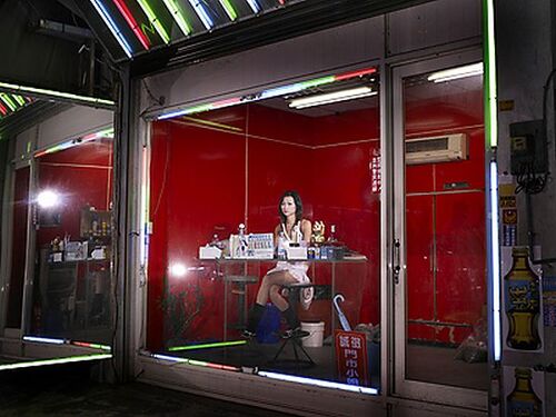 この写真を見ていただきたい。大きなガラス張りの部屋の中に一人の女性がぽつねんと座っている。部屋の中には調度品があるわけでもなく、女性の前のカウンターに、何か雑多なものが置かれているだけだ。ガラス窓の隅に見える文字から、これは東南アジアのど…